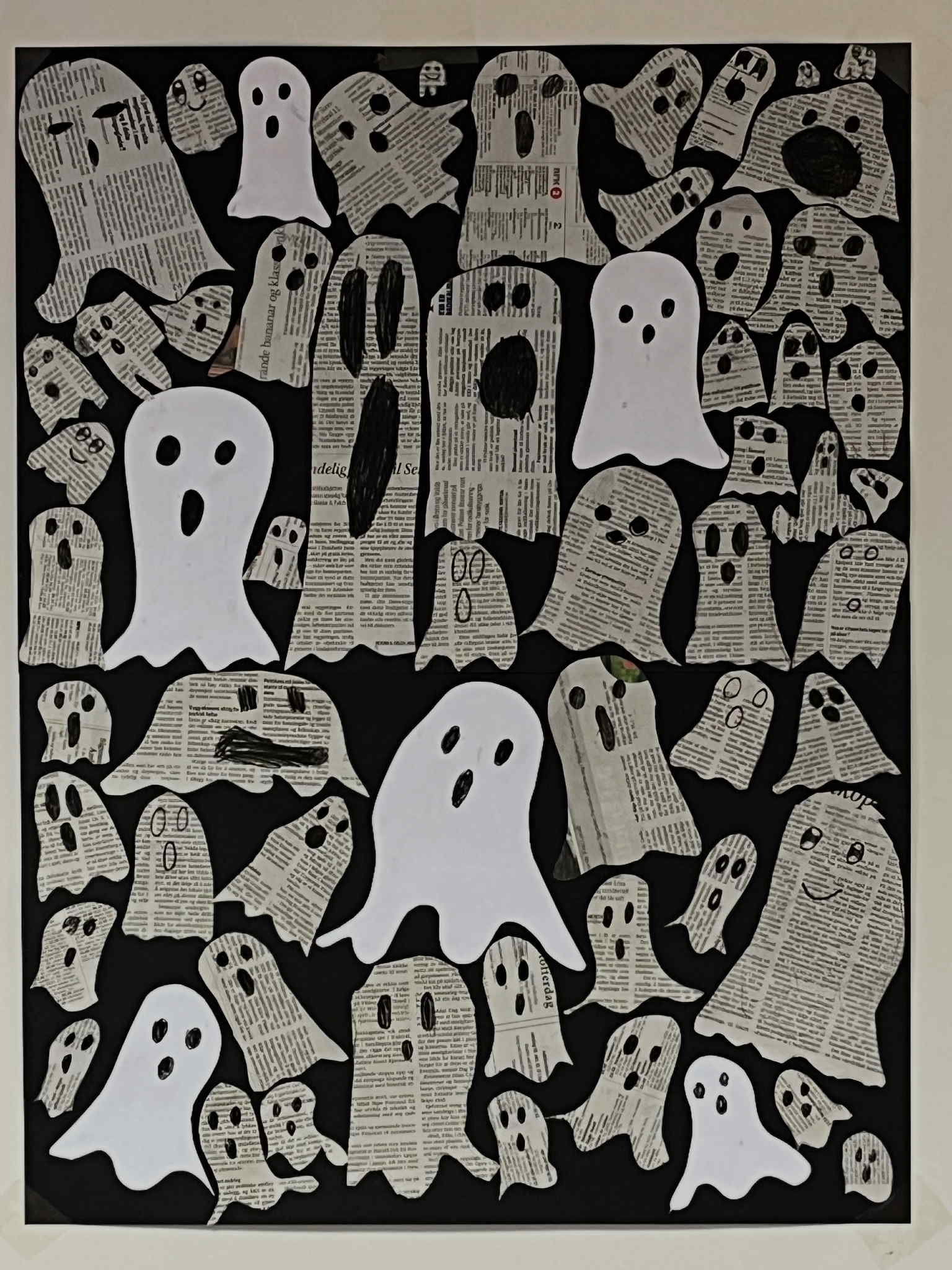 Avisveka (v. 44) kjem kvart år tett på Halloween, så kvifor ikkje slå to fluger i ein smekk? I Hundeidvik fann dei fram gamle aviser, blyantar og saks – og sette i gang med å lage spøkelseskunst av gamle nyhende!