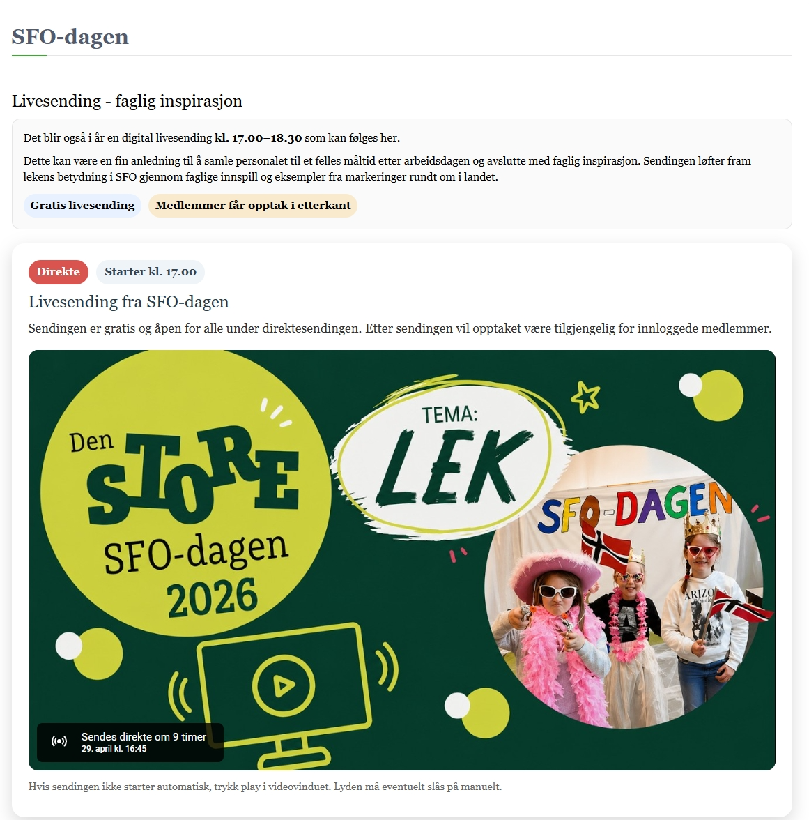I dag markerer vi Den store SFO-dagen over hele landet. En dag for lek, fellesskap og stolthet. Samtidig inviterer vi til en livesending full av inspirasjon, praksisnære eksempler og faglige løft som kan tas rett inn i hverdagen.